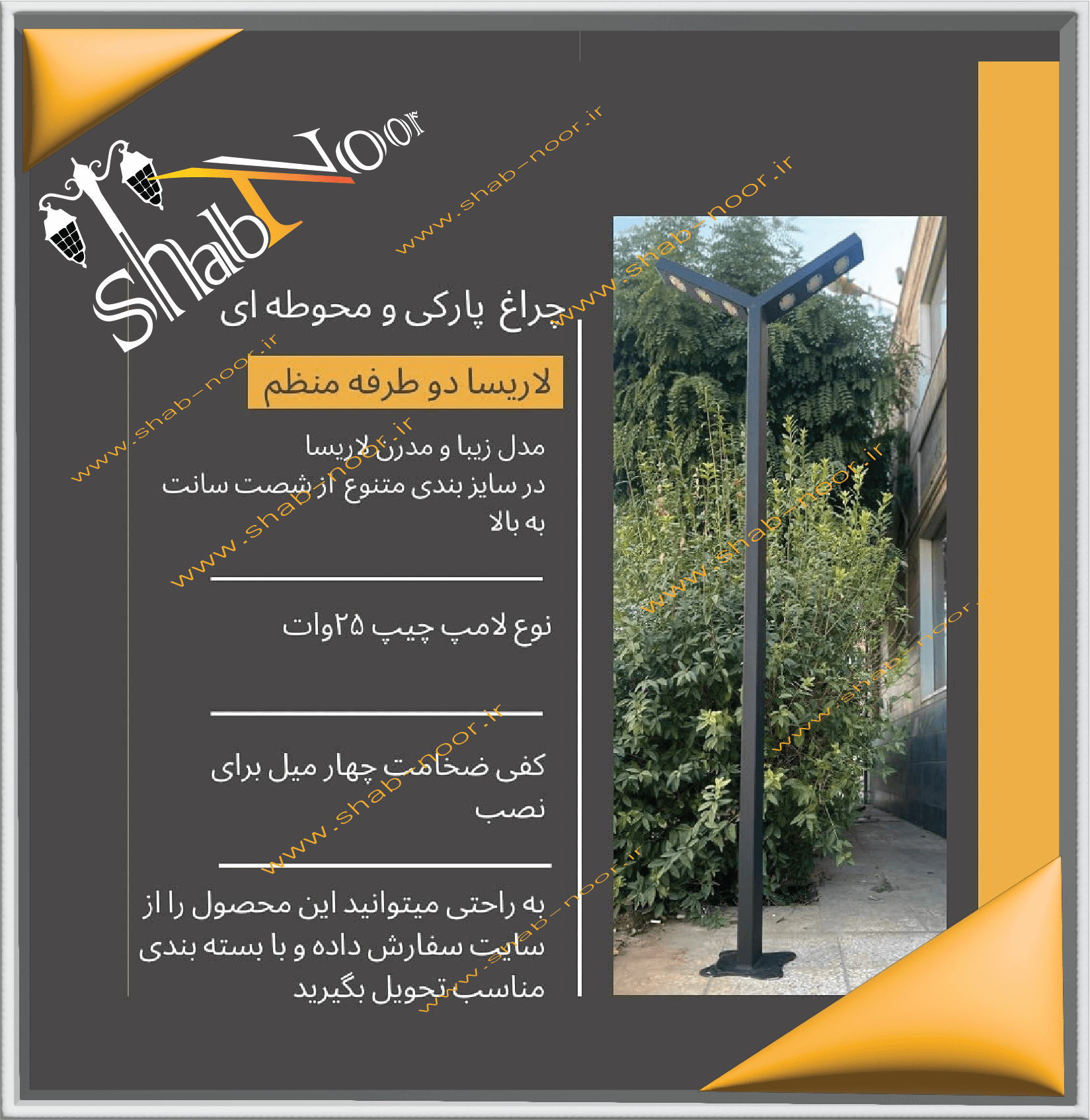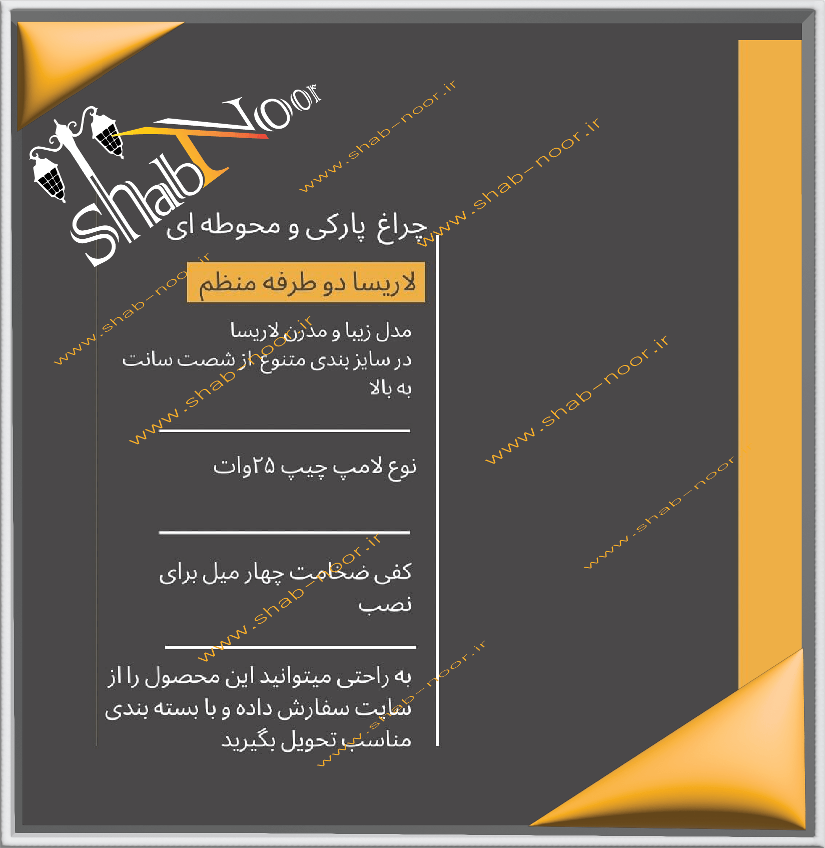 یکی از کامل ترین فروشگاه‌ها در زمینه چراغ‌های پارکی فروشگاه شب نور است که سِت کامل از تمام چراغ‌های دیواری،سردری،سرلوله،آویز و چراغ های دوشعله در سه ساختار بدنه مختلف پلاستیکی،فلزی و آلومینیوم را در خود جمع آوری کرده و با مناسب‌ترین قیمت به بازار ارائه میدهد.